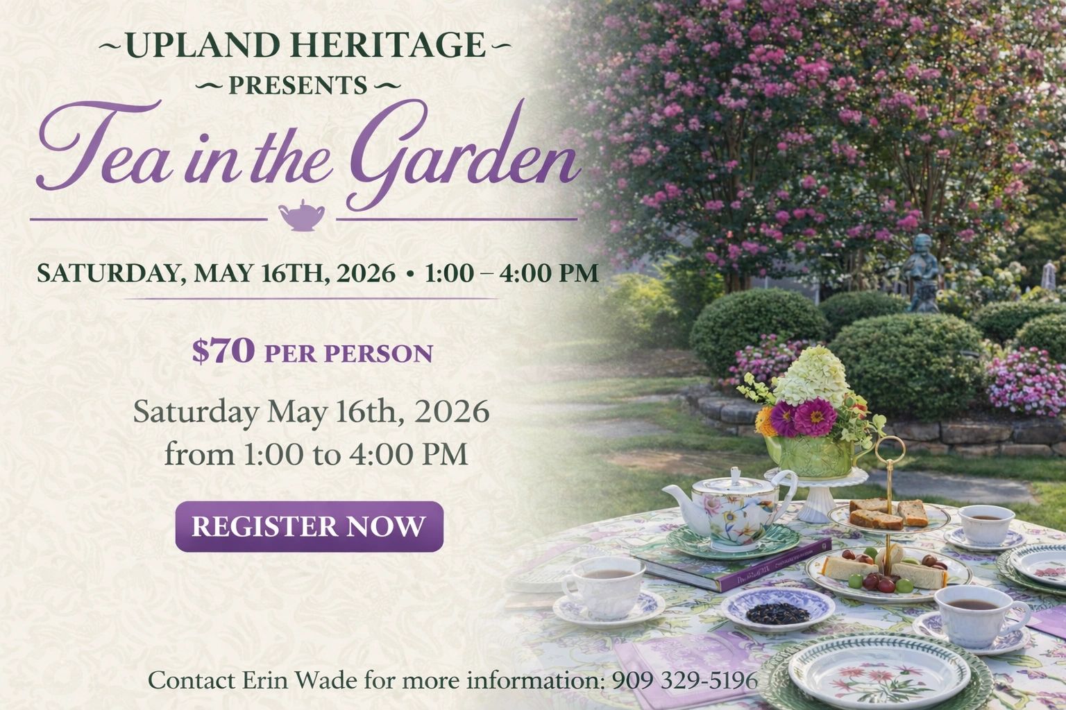 Upland Heritage Presents: Tea in the Garden on Saturday, May 16th from 1:00–4:00 PM. Enjoy a traditional English tea service paired with a lovely art sale, all set within the enchanting gardens of 2270 N Euclid Ave. Upland CA. Early member registration is now available. Contact Erin Wade for more info: 909.329.5196